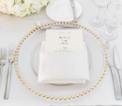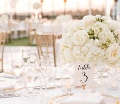 A sleek, modern yet elegant wedding took place on a rooftop over viewing Hollywood. An all white classic with beautiful variations of lush floral centerpieces, white sheer drapery falling from the sky and a touch of unforgettable gold details. A perfect night dancing on top of the city.