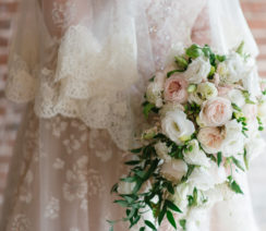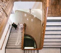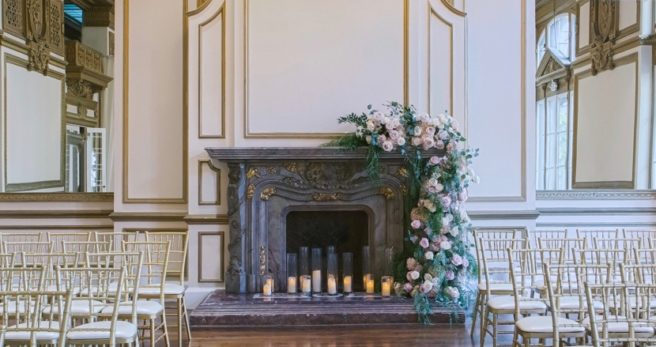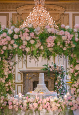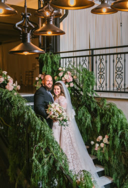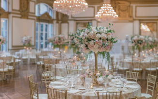 This gorgeous indoor wedding took place in gold featured ballroom. The blush colored centerpieces and floral arches softened the gold accents throughout the ballroom and gave a elegant touch to the romantic wedding.