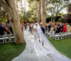 A rustic and modern event at Calamigos Ranch. A reception on an intimate grass meadow, surrounded by oak trees and private patios draped with twinkling lights. The type of ranch wedding people dream of; natural wood and green feeling. Such an outdoor romantic day celebration.